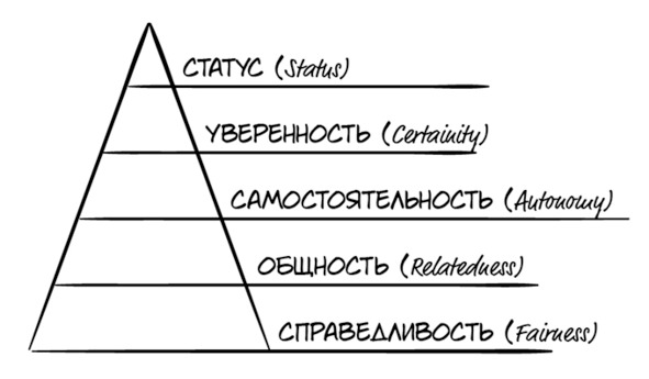 В замечательной книге Дэвида Рока «Мозг. Инструкция по применению. Как использовать свои возможности по максимуму и без перегрузок» [3] приведена модель SCARF, описывающая межличностные первичные удовольствия или угрозы, важные для мозга: потребность в справедливости (Fairness), общности (Relatedness), самостоятельности (Autonomy), уверенности (Certainty), статусе (Status).