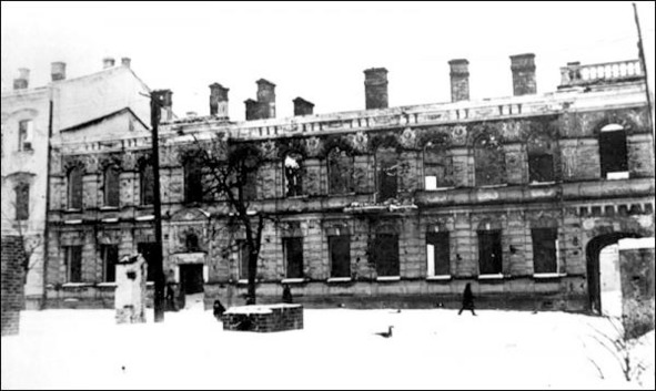 «Госпиталь, в котором служил Петровский. Вскоре после боев, госпиталь был разрушен»