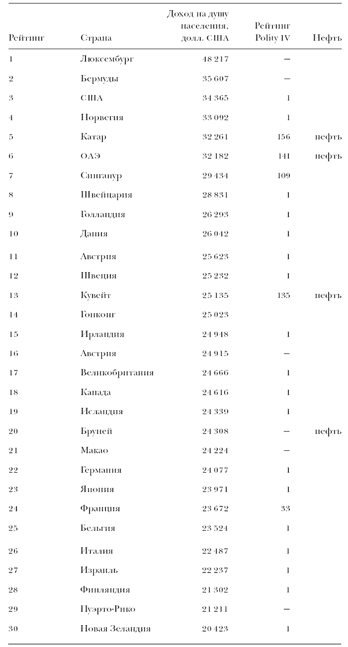Источники: Данные о реальном доходе на душу населения в долларах США 2000 г. приводятся по: Heston, Summers and Aten, 2006. Рейтинг «Демократия» проекта Polity IV приводится по: Marshall, Jaggers, 2005. Рейтинг уровня развития демократии берется от 10 до 0 в целочисленных значениях. Все страны, которым присвоено наивысшее значение 10, имеют рейтинг 1. Страны, которым присвоено второе значение, как Франция, имеют рейтинг 33. В рейтинг Polity IV входят 159 стран. В рейтинг не вошли малые государства. Страны без рейтинга имеют обозначение «—».