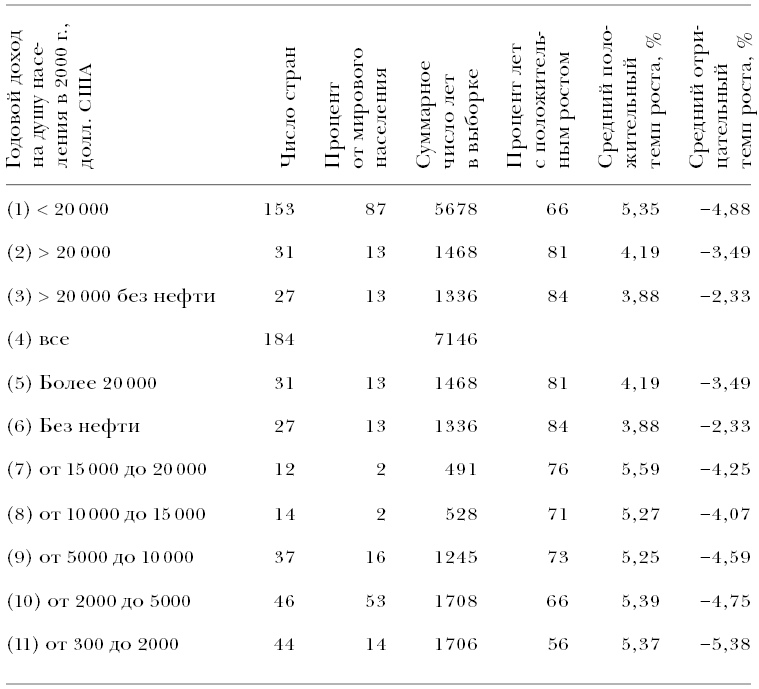 Источники: Heston, Summers and Aten, 2006. В таблице использованы данные по реальному ВВП на душу населения (постоянные цены: последовательные серии) и рассчитанные по ним темпы роста для серий «Темп роста реального ВВП (постоянные цены: последовательные серии)». Сначала страны были отсортированы по категориям доходов на основе их доходов 2000 г., измеренных в долларах 2000 г. Средние годовые положительные и отрицательные темпы роста представляют собой простое среднеарифметическое для всех лет и всех стран по категории доходов (нулевой рост считался положительным ростом) без всякого взвешивания. Таблицы, составленные Центром международных сравнений университета штата Пенсильвания (Penn World Tables), включают информацию по 188 странам, но сведения о темпах роста доступны только для 184 стран. Выборка охватывает период с 1954 по 2004 г., хотя информация недоступна для каждой страны в каждый год. Категория стран «без нефти» с доходами свыше 20 000 долларов не включает Катар, Объединенные Арабские Эмираты, Кувейт и Бруней.