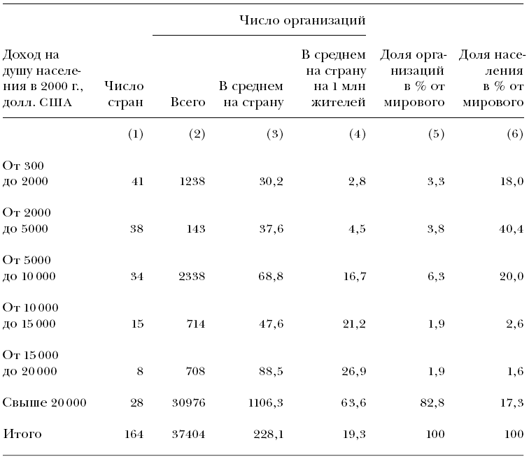 Для 37 404 таких организаций в 164 странах данные по доходам можно было сопоставить с данными из справочника издательства K. G. Saur. Самые бедные страны с доходом менее 2000 долларов в год имели в среднем по 30 организаций и по 28 организаций на миллион жителей (столбцы 3 и 4 в таблице). На страны с более чем 20 000 долларов годового дохода приходится в среднем по 1106 организаций и по 64 организации на миллион жителей. Число организаций на миллион человек стабильно растет с увеличением дохода (столбец 4). На страны с доходом на душу населения менее 10 000 долларов приходится 78,4 % населения в выборке (столбец 6) и всего 13,1 % организаций в выборке (колонка 5). Данные по странам демонстрируют заметную корреляцию между числом организаций и уровнем экономического и политического развития.