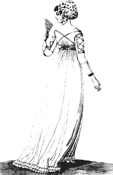 О. МандельштамКаролина де ла Мотт Фуке, немецкая писательница эпохи романтизма и супруга барона Фридриха де ла Мотт Фуке, автора «Ундины», на склоне лет решила запечатлеть для потомков нравы и вкусы своей юности: так в 1829–1830 годах появилась одна из первых книг по истории моды. Немалое внимание в ней уделяется поистине удивительному феномену конца XVIII – начала XIX века – «нагой моде»: «Дамы носили греческие одеяния с плотным поясом под грудью. Из-под него вниз струились мягкие пышные складки, руки выше локтя были открыты, волосы стянуты на затылке в узел… Женщины походили на античные статуи, чудом попавшие из классики в современность»[206].