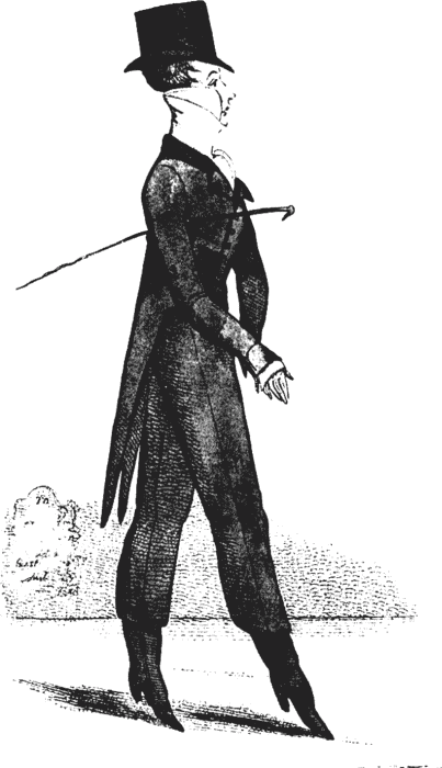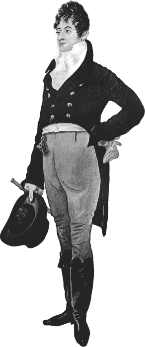 Карикатуристы беспощадно высмеивали опасности, подстерегающие усердных модников[147]. Да и сам Браммелл, имея дело с «перекрахмаленными» щеголями, не упускал случая отпустить пару саркастических замечаний в их адрес. Будучи лидером моды, он презирал тех, кто, следуя последним тенденциям, жертвовал собственным комфортом и выставлял себя на посмешище. Созданный им костюм, будучи вначале необычным и модным, стал затем общепринятым именно потому, что в нем отсутствовали декоративные излишества и он не стеснял свободу движений.