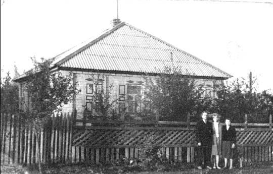 Дмитрий Алексеевич Савенков с женой и племянницей Валентиной на фоне своего дома в поселке Шолоховский, 1966 год