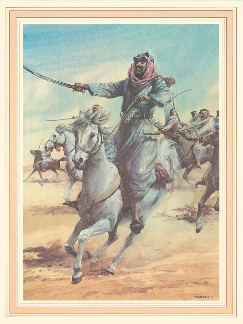 Al poco, Ibn Saud saltó a tierra y cuando los demás le imitaron extrajo su alfanje, pareció presentarlo como ofrenda entre las dos manos y enfatizó: