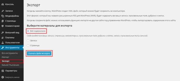 В первую очередь следует отметить, что WordPress предоставляет кое-какой базовый функционал резервного копирования. Ознакомиться с ним можно в разделе Инструменты → Экспорт. Выбрав, что именно вы хотели бы сохранить в бэкап, вы можете скачать к себе на компьютер XML-файл, содержащий всю текстовую информацию с вашего сайта.