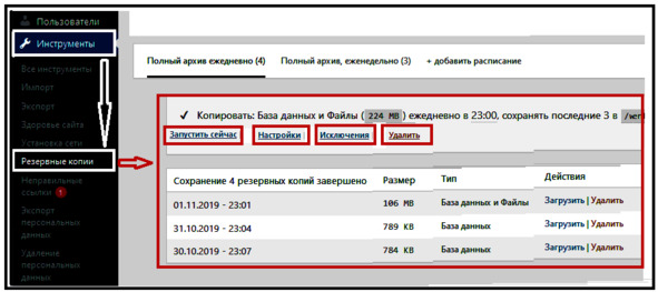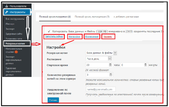 – Путь для настроек плагина: Консоль/Инструменты/Резервные копии