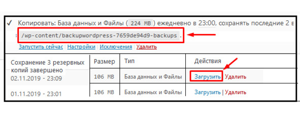 После сохранения в верхней части страницы появятся строчки, в них написано куда будут сохраняться backup файлы в wordpress. В любой момент вы можете создать копию всего сайта вместе с базой данных и Загрузить последнюю копию сайта в виде zip-архива к себе на компьютер.