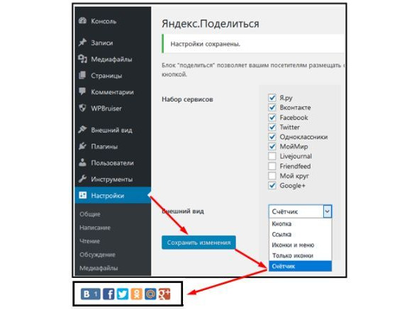 Плагин Яндекс. Поделиться позволяет выбрать необходимые вам кнопки социальных сервисов и оформление блока. Наиболее интересным представляется вид блока кнопок в виде счётчика – на кнопках отображается количество человек, отправивших ссылку на просматриваемую страницу, в разные социальные сервисы.