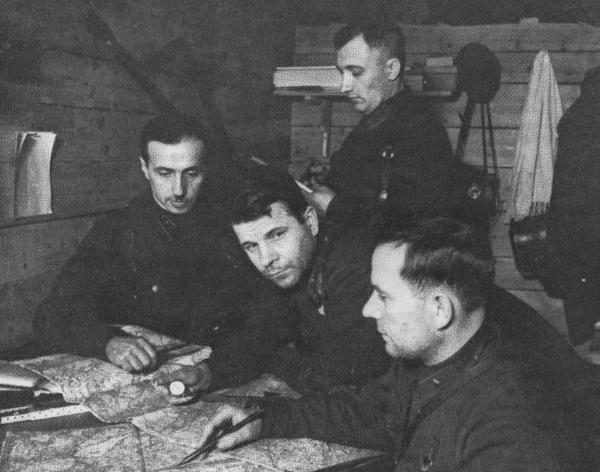 Слева направо: зам. начальника 4-го (разведывательного) отдела штаба 7-й армии майор Н.С. Голосницкий, помощник начальника отдела по командноначальствующему составу штаба Калининского военного округа майор М.Г. Лаврентьев, помощник начальника 4-го (разведывательного) отдела штаба Калининского военного округа капитан В.М. Грицай и начальник 4-го (разведывательного) отдела штаба 7-й армии комбриг П.П. Евстигнеев