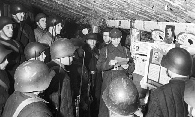 Политрук зачитывает красноармейцам приказ о начале военных действий против Финляндии