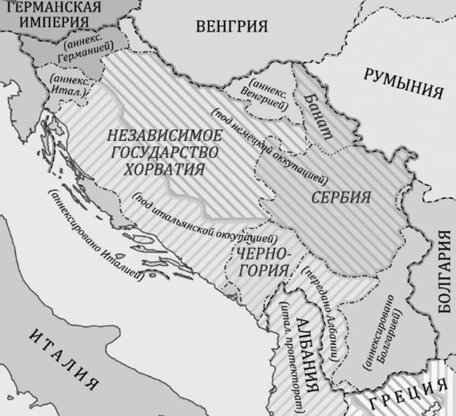 Просуществовала «первая Югославия» недолго. 6 апреля 1941 г. она была оккупирована и расчленена странами оси. Часть ее территории вошла в состав Великой Албании под протекторатом итальянского короля Виктора-Эммануила III. Фашистское Независимое государство Хорватия получило часть территорий Боснии и Герцеговины. В историю эти протектораты вошли как пример почти животной ненависти к сербам. По последним данным, в результате геноцида погибли 800 000 сербов. Около 200 000 сербов были насильно обращены в католичество, 400 000 вынуждены были бежать в Сербию. Главным итогом деятельности фашистских режимов в Албании и Независимом государстве Хорватия стало изменение этнической карты региона и закрепление ненависти между соседними народами