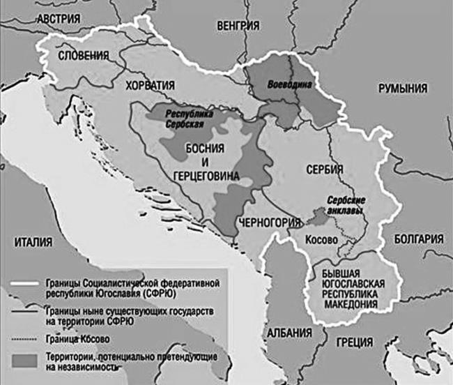 Параллельно культивировался и поощрялся национализм в Словении и Хорватии как самых богатых республиках, которые не хотят больше «кормить» отсталые территории. Албанское большинство Косово и Метохии требовало статуса республики. Фактически югославское государство не представляло собой нечто целое уже по конституции 1974 г., т. е. Югославия к концу 1980‑х представляла собой хорошо подготовленную горючую смесь. Спичкой, которая разожгла пожар межнациональных войн, оказалось не столько провозглашение независимости республик, сколько признание новых государств в существующих границах международным сообществом.
