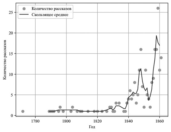 Рис. 1. Количество новых рассказов о крестьянах по годам (1772–1861)