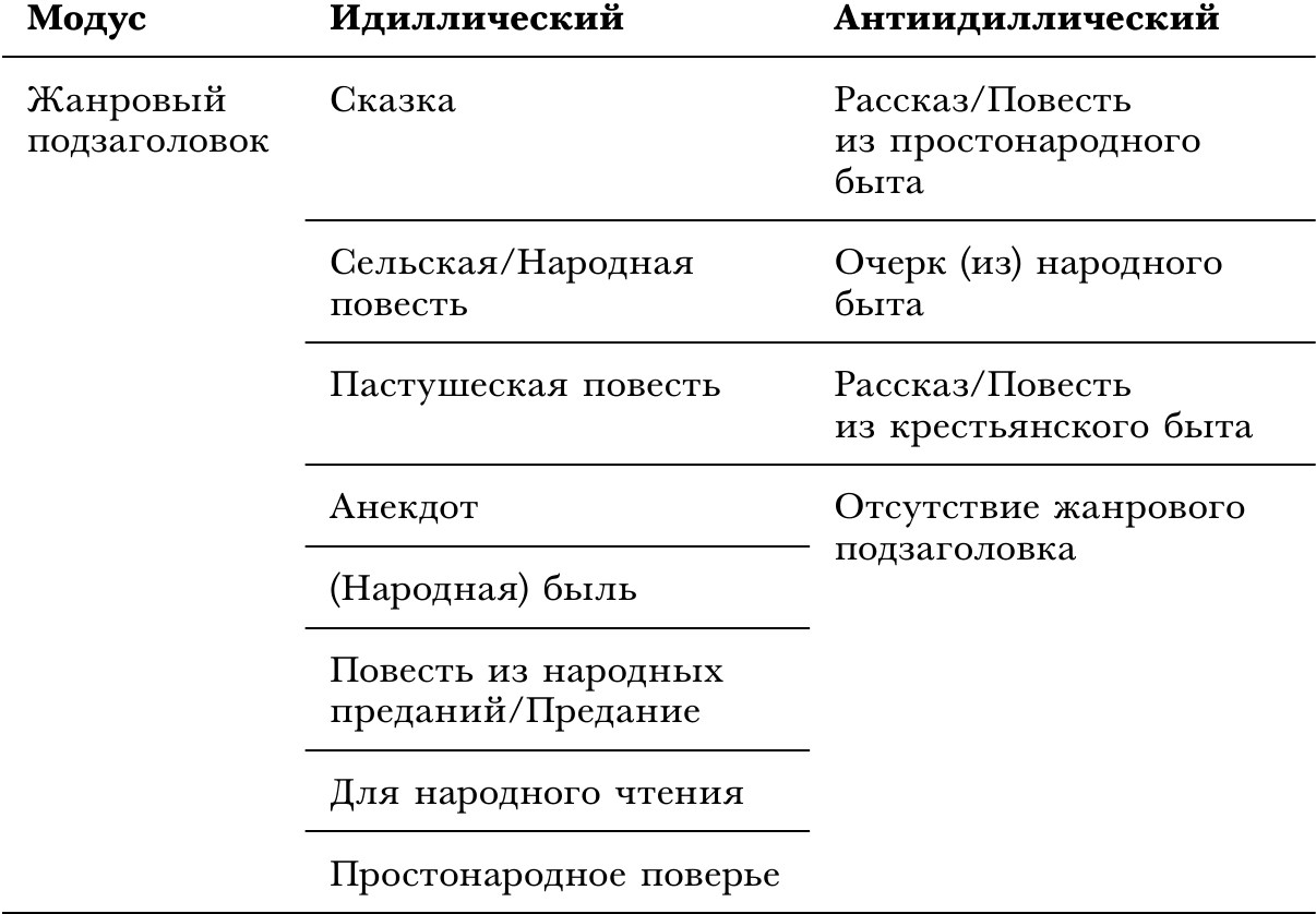 Таким образом, для обозначения сложной внутренней борьбы новых жанровых форм с классическими я решил прибегнуть к экзогенному определению «рассказ из крестьянского быта». Пусть оно и не идеальное, зато очень точно отражает объект исследования в этой книге – литературное изображение различных типов крестьян и их сообществ во взаимодействии с другими сословиями и государственными институтами в Российской империи до отмены крепостного права. В итоге в табл. 2 представлена, насколько это возможно, выявленная корреляция между разными типами жанровых подзаголовков и жанровых модусов, эволюционировавших на протяжении более чем 70 лет вплоть до 1861 г. Примечательно, что выдвинувшийся в центр литературной системы антиидиллический модус привел к почти полному отказу от фольклорных маркеров и к минус-приему – полному отсутствию жанрового подзаголовка как такового. В самых известных антиидиллических текстах типа «Деревни» Григоровича или «Постоялого двора» Тургенева подзаголовки отсутствуют, а в других ярких образцах этого тренда – рассказах Марко Вовчок или Н. В. Успенского – жанровое указание вынесено в название сборника («рассказы» или «очерки»).