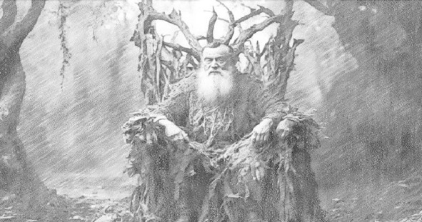 Дуб зашумел листвой, качнул тяжелыми ветками и затих; из тумана под ним показался Старик, сидящий на сплетенном из веток и корней дуба троне и покачивающий на голой ноге с длинной и худой стопой какой-то круглый комок шерсти с горящими глазами.