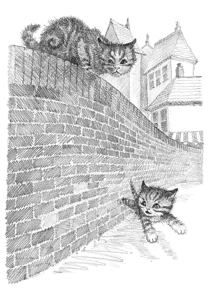 Ей показалось, что она просидела за баком несколько часов, наконец Пушинка решилась выйти. Теперь, когда стало темно и людей было гораздо меньше, она чувствовала себя в большей безопасности. Она с надеждой понюхала воздух. Вокруг пахло едой, но она не имела понятия, откуда идёт этот запах. Если бы она вернулась на ферму, её бы уже сейчас накормили, в животе громко заурчало. Пушинка кралась вдоль тротуара, скрываясь в полутьме, пока наконец магазины не сменились домами и садами. Она запрыгнула на стену, чтобы осмотреться, немного перевести дух и подумать, что делать дальше.