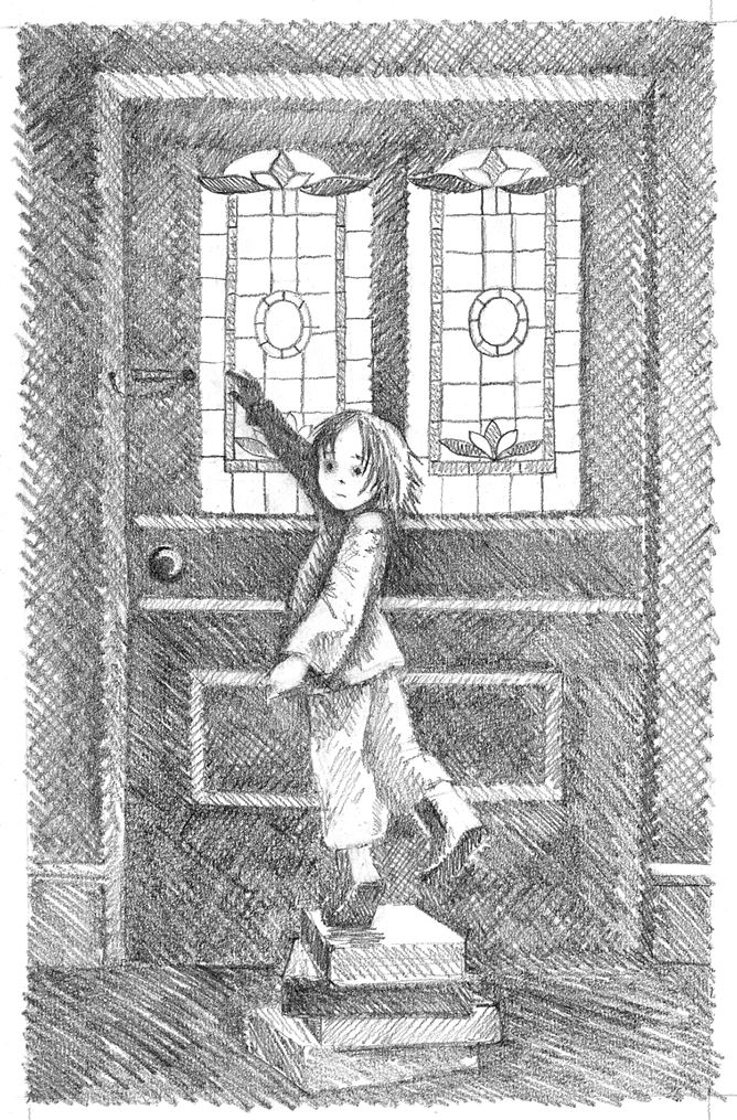Уличный фонарь отбрасывал странные синие и зелёные тени через витраж двери, отчего Элла выглядела как маленький призрак.