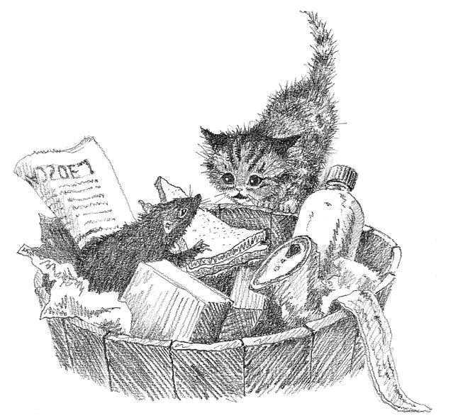 Очень скоро она пришла к мусорному баку, прикреплённому к фонарному столбу. С надеждой Пушинка принюхалась: из него определённо пахло едой. Далеко не с первой попытки Пушинке удалось забраться на край мусорного бака, наконец она перевела дух. Глубоко вздохнула: сыр! Сара иногда отламывала ей кусочки сыра от бутерброда, а в этом баке определённо был сыр. Чувствовался ещё один нечёткий запах, немного напоминающий мышиный, но Пушинка не была уверена.
