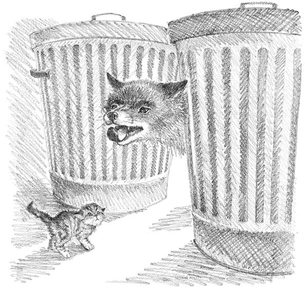 Малышка попятилась, протискиваясь в узкую щель между двумя мусорными баками, откуда лиса не смогла бы её достать. Едят ли лисы котят?
