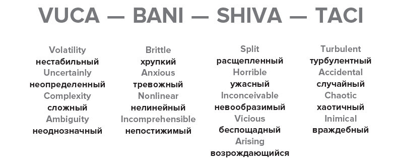 С начала пандемии появились еще две аббревиатуры российского происхождения – SHIVA и TACI. Когда я смотрю на эти описания моделей мира, мне становится грустно и как-то неуютно. Неужели только это нас окружает и формирует нашу действительность?
