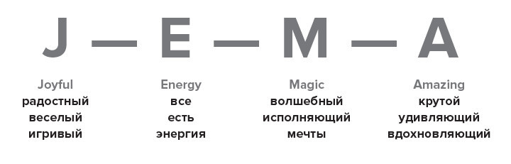 Хочется ли вам видеть вокруг непостижимую тревожную неопределенность? Лично мне нет. Поэтому я придумал свою призму, которую назвал JEMA. Где J – joyful, то есть радостный, счастливый, веселый. Это такой мир, в котором всегда есть место игре и улыбке, мир, который радует, в котором радость не под запретом. E – energy, то есть мир, в котором все – энергия, она в каждом поступке и выборе, в каждом из нас есть определенный уровень энергии, которую можно отследить и измерить, и важно этой энергией управлять. M – magic, то есть необычный и имеющий какие-то свои законы мир, мистический, реализующий наши мечты и желания, живой, имеющий свой замысел, пусть иногда и непонятный, но который важно принимать с благодарностью. A – amazing: офигительный, крутой, вдохновляющий, удивляющий, возбуждающий интерес. Из любопытства я посмотрел значение получившегося слова в интернете и удивился. Оказывается, в переводе с суахили jema – это «хорошо».