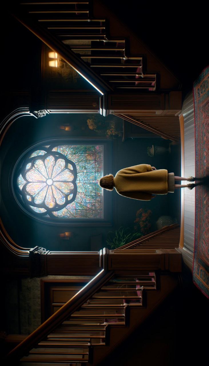 Теперь я могла рассмотреть этот дом как следует, ведь я уже и забыла, как здесь всё было, когда я была маленькой. Выйдя на лестницу, первым делом в глаза мне бросился витраж: утренний свет проходил сквозь стекло и освещал коридор разноцветными лучами. Кажется, там что-то было написано на другом языке. Не знаю почему, но я стала всматриваться в узор, задумалась. Становилось легче: будто это как-то связано с родителями, будто они рядом…