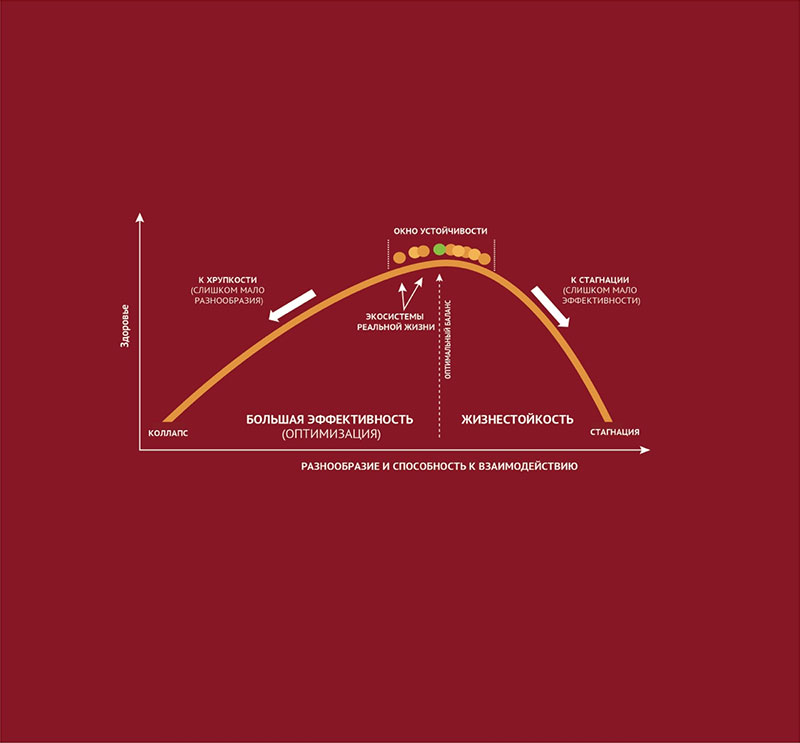 Если не брать для метафоры машины, что тогда взять? Живые системы не просто сложны, как машины или летательные аппараты, они комплексны и разнообразны. Это означает, что они динамичны и полны откликов и реакций – не только изнутри, но и снаружи. Живые системы могут изменяться, мы это знаем, поскольку мы люди и чувствительны к тому, как они соединены, и к начальным условиям: чтобы понять, каков я сейчас, нужно также понять, как я рос, – у этих систем есть история. Они не предустановлены, не предопределены, словно машины, но при этом не случайны и не хаотичны. Они могут выживать и процветать. Мы спрашиваем, есть ли правила и паттерны в этих сложных, реагирующих, разнообразных живых системах, которые могут помочь нам изменить свои убеждения, в том числе, например, об экономике.