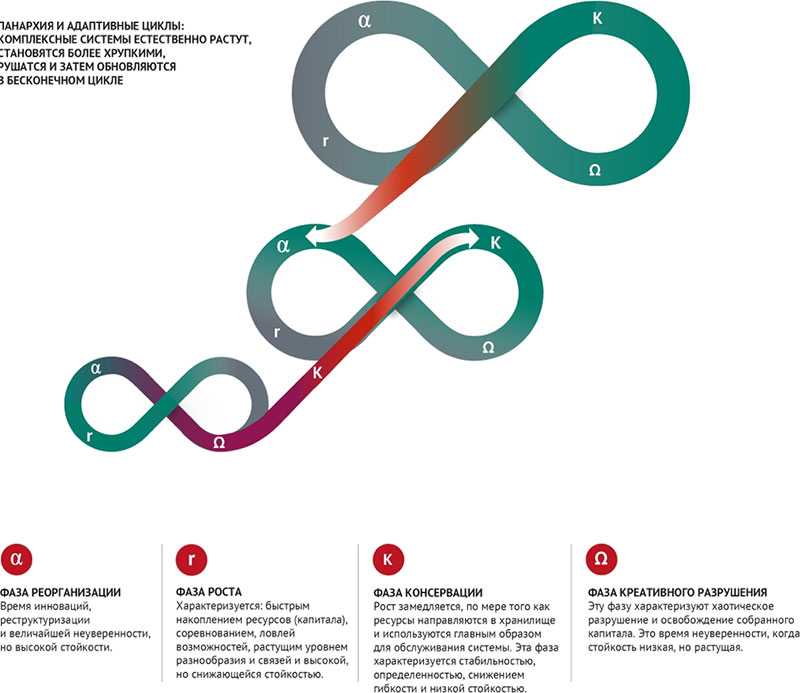 Теория панархии помогает нам понять, как комплексные системы любого рода, включая экологические, социальные и экономические, эволюционируют и адаптируются. Томас Гомер-Диксон[12] писал о том, что у этой теории есть много общего с другими теориями об адаптации и изменениях в комплексных динамических системах. Ее ключевая идея – системы естественно растут, становятся более ломкими, ломаются и затем обновляются в бесконечном цикле – постоянно возникает в литературе, философии, религии и трудах по истории человечества, а также в естественных и социальных науках. Но Базз Холлинг не просто повторил эту старую идею.