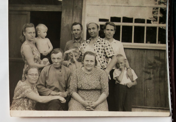 Родительский дом во дворе: Мама, брат Саша, П.Т.Токарев, П.П.Токарев, папа, тётя Аня, дед Михаил, брат Лёня Токарев, баба Мотя и я.