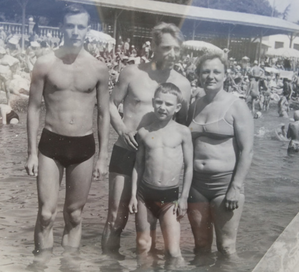 На отдых в Крым мы в первый и единственный раз приехали всей семьёй: отец и мама, я и младший брат. Я закончил девятый класс, брат Саша четвёртый. Папе сорок четыре года, маме сорок. Поселились мы в двухместном номере пансионата в г. Алуште. Поскольку путёвка была на двоих взрослых, мы с братом в качестве входа часто пользовались балконом первого этажа. Периодические проверки пропусков осуществлялись только на входе в пансионат. В столовой пансионата комплексный обед на двух человек мы делили на четверых. В основном мама подкладывала нам от своей порции. У наших земляков и соседей по номеру была дочка моложе меня, но старше брата. Были в пансионате ещё отдыхающие с детьми. Наш зверский детский аппетит потом на пляже удовлетворяли пирожками компотом и мороженым. То-ли от жары, то-ли от не очень комфортных условий, но у отца тогда впервые случился приступ эпилепсии.