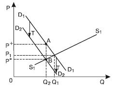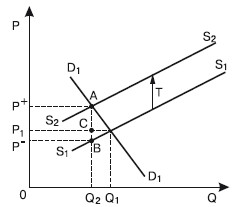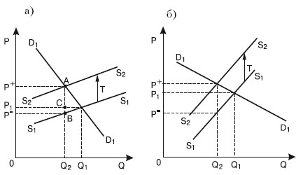 В результате введения налога произойдет сдвиг линии предложения вверх на величину Т, ибо для получения той же суммы выручки продавец будет согласен продать данное благо за цену, которая выше прежней на величину Т р. Линия предложения займет положение S2S2. На рынке устанавливается новое равновесие, при котором объем продаж сократится с Q1 до Q2, ценадля покупателей повысится с Р- до Р+. Общая сумма налога, поступающая в госбюджет, будет равна площади прямоугольника Р+АВР-. Налог, согласно условию этого варианта, уплачивают продавцы, но бремя налога распределяется между продавцами и покупателями. Взнос продавцов равен площади прямоугольника P1CBP-, а взнос покупателей – P+ACP1.