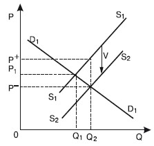 Допустим, что введена дотация из госбюджета производителям данного блага размером V р. на каждую единицу. В результате произойдет сдвиг линии предложения вниз на V р., поскольку дотация продавцам будет равнозначна снижению их издержек. Ранее производители были согласны продать объем блага, если цена без дотации будет на V р. ниже P1. В этом случае объем продаж возрастет до Q2, цена для покупателей понижается до Р-, цена, получаемая производителями, повышается до Р+.