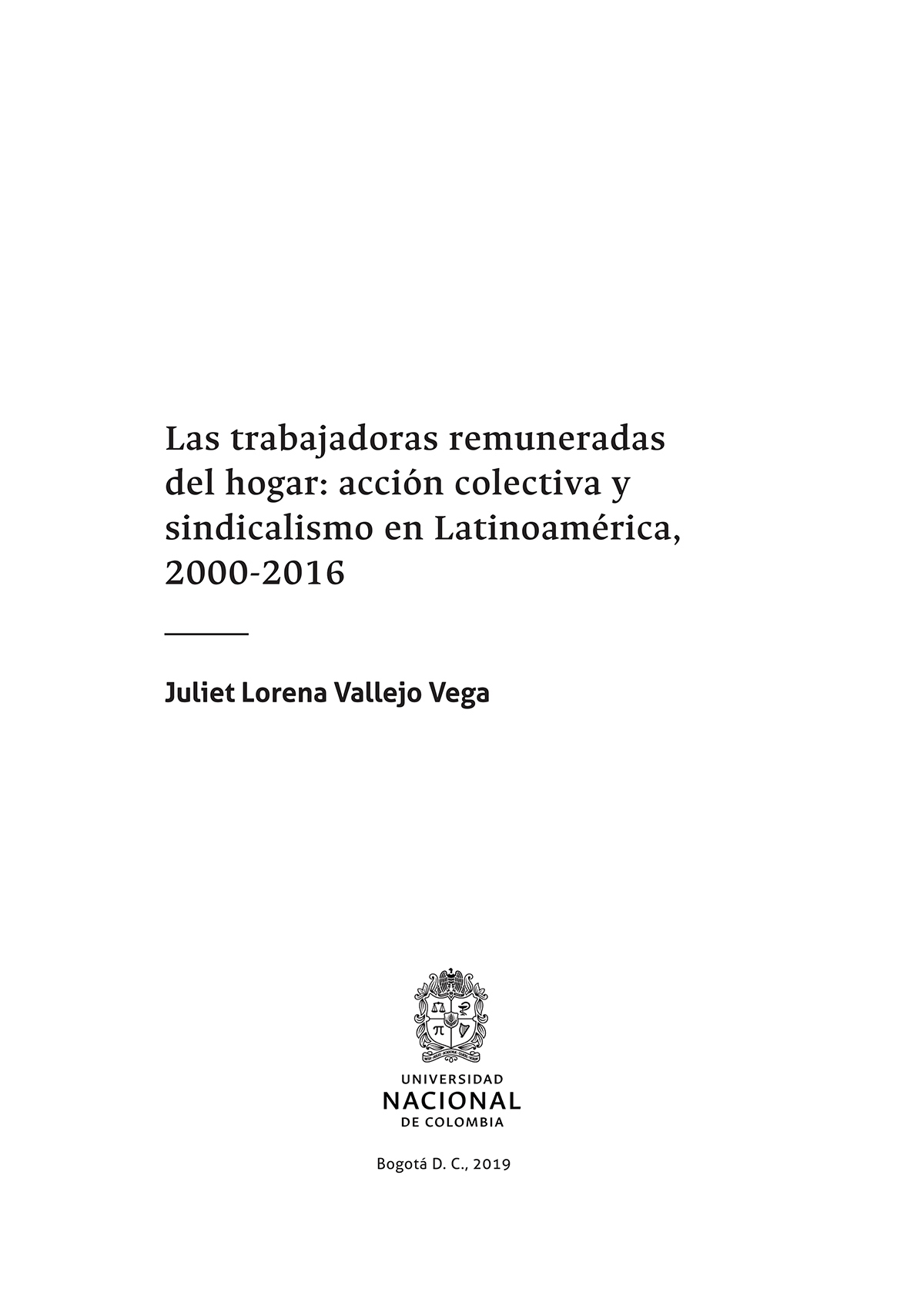 Las trabajadoras remuneradas del hogar : acción colectiva y sindicalismo en Latinoamérica, 2000-2016 / Juliet Lorena Vallejo Vega. -- Primera edición. -- Bogotá : Universidad Nacional de Colombia. Facultad de Derecho, Ciencias Políticas y Sociales. Maestría en Estudios Políticos Latinoamericanos, Instituto Unidad de Investigaciones Jurídico Sociales Gerardo Molina (UNIJUS), 2019.