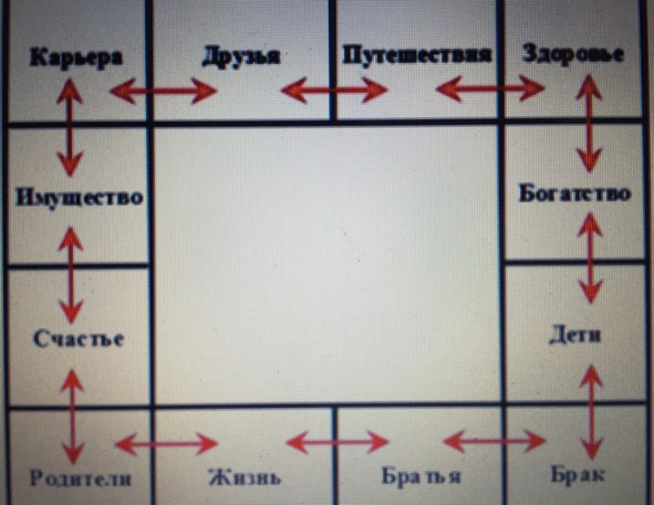 Теперь если мы объединим возможные варианты влияния дворцов друг на друга, которые перечислены выше, то получим структуру взаимного влияния дворцов пример на рисунке ниже. Рассматривая взаимное влияние звезд в структуре каждого из дворцов, можно получить полную картину событий, происходящих с человеком.