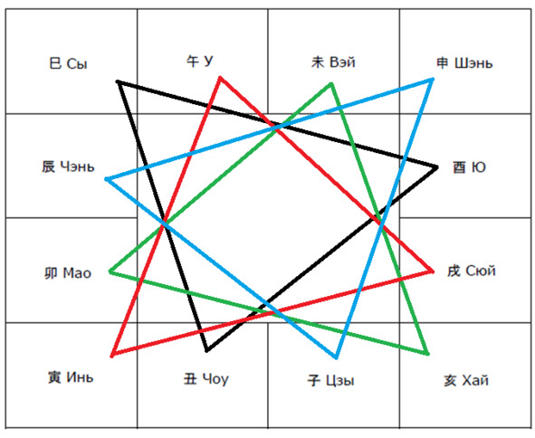 Звезды родственных дворцов корректируют информацию, которую дают нам звезды исследуемого дворца. Это дворцы, расположенные в секторах, Земные ветви которые образуют тройную комбинацию.