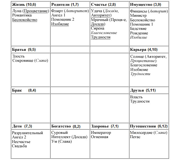 Каждый из двенадцати дворцов карты также соответствует одной из двенадцати областей жизни человека. При этом есть одна область, для описания которой используется сразу два