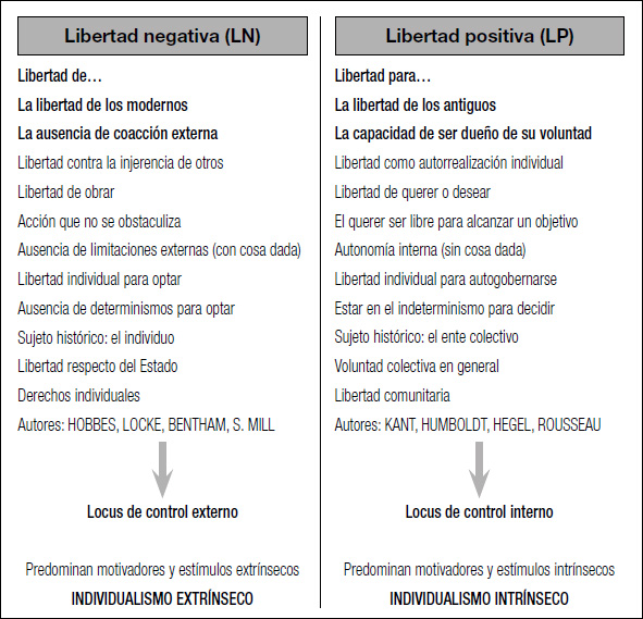 Todo parece indicar que la LN se correspondería con un locus de control externo, es decir, ajeno al sujeto, ya que el Estado o la sociedad se encarga de controlar el ejercicio de estas libertades. En este conjunto de libertades, el individuo es prisionero de la tolerancia o intolerancia social, dicho de otro modo, los estímulos y motivadores que activan al sujeto son extrínsecos a él, y él es objeto, no sujeto, de su propia motivación. En sentido contrario, la LP se ejercería desde el locus de control interno, es decir, desde el control del propio sujeto que actúa como fuente de motivación y refuerzo autónomo e independiente. Predominan en este supuesto los motivadores, premios o castigos internos autoaplicados por el sujeto, al margen de la aceptación o rechazo social. En este segundo supuesto, el individuo es el sujeto de su propia motivación. Aquí predominan los refuerzos y motivaciones, internas o intrínsecas, que, traducidos al lenguaje de Edward L. Deci (1975 y 1985) se corresponderían con la motivación intrínseca, si bien en su conducta intrínsecamente motivada pueden intervenir valores, ideas, creencias e intereses de origen externo.