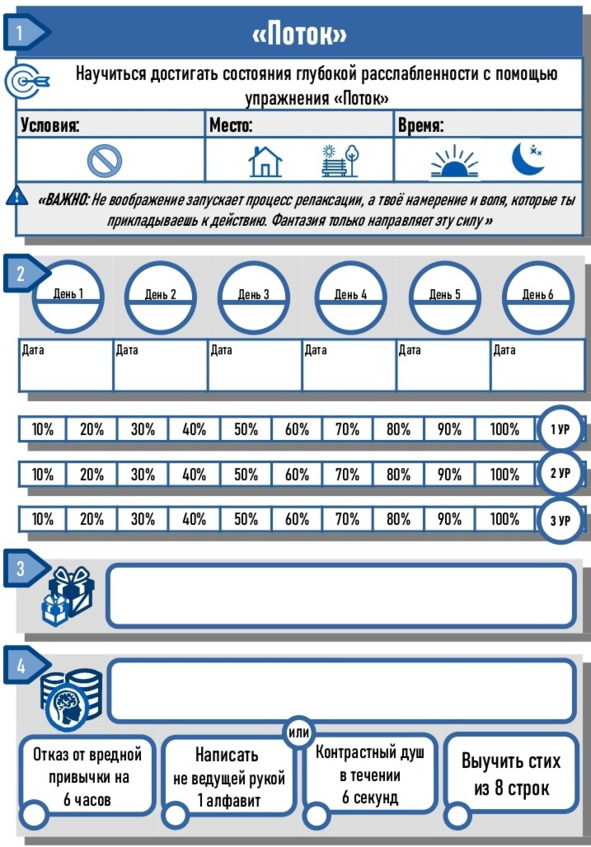 Если овладеть этими двумя методами, они станут основой твоей способности релаксировать и управлять напряжённостью в теле. «АТ» и «Поток» позволяют научиться владеть своим вниманием, направлять своё намерение и мысли, а также удерживать концентрацию.