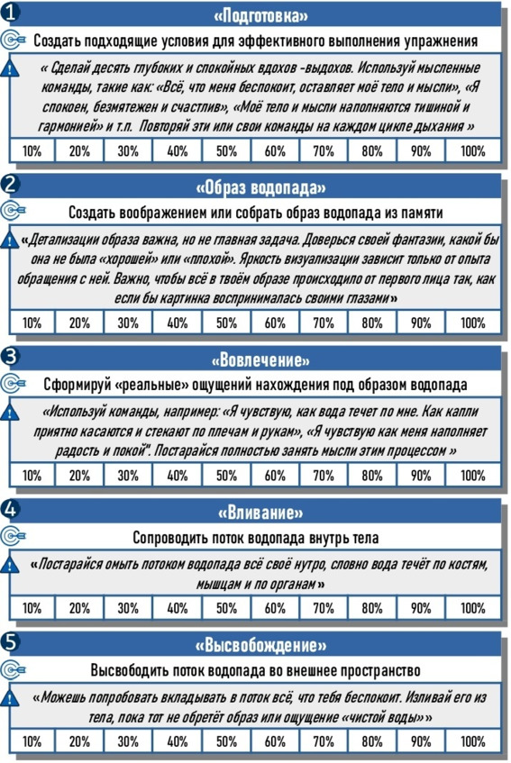 3. Вовлечение: Ощутить, как вода стекает по телу: капли касаются головы, плеч, рук. Определить температуру воды (холодная или тёплая). Удерживать образ 5 минут, направляя внимание на ощущения, например: «Я чувствую, как вода течёт по мне», избегая посторонних мыслей.
