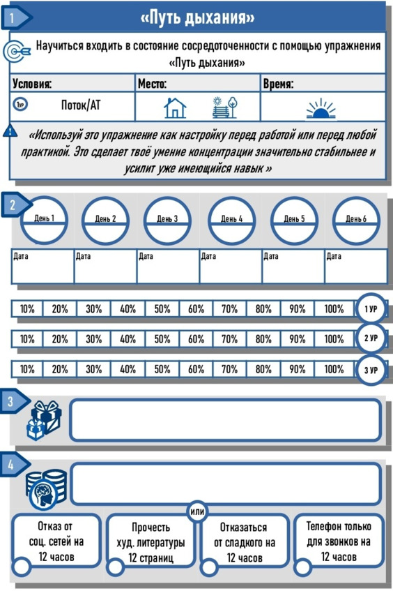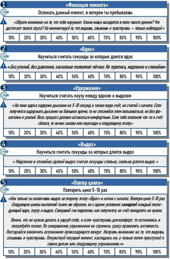 Суть практики достаточно проста, но, как и любая практика, трудность именно в выполнении. Предстоящее упражнение занимает 10—15 минут. Напомню, что твоя концентрация – это не что иное, как устойчивое внимание на чём-либо. Метод разделён на четыре этапа. Первый этап является подготовительным, а последующие три – «вдох-удержание-выдох» – это один цикл дыхания. Начать можно с пяти циклов и постепенно увеличивать, добавляя по одному цикл каждую тренировку и в конечном итоге дойти до 20 циклов. Это не является каким-то строгим правилом, и ты вполне можешь ограничиться десятью циклами. Делай столько, сколько можешь себе позволить, и даже это принесёт результат.