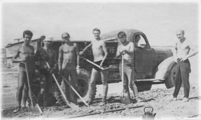 Погрузка гравия: два человека на машину, четыре тонны в кузов, двадцать две копейки тонна, десять машин в день. Однажды мы, грузчики, шарахнули горячей водки, и пустыня изогнулась радугой. Я с краю.