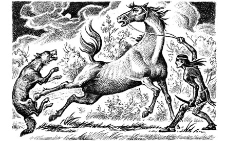 Харка издал предостерегающий крик. Три волка уже терзали одну из лошадей. Вероятность того, что они нападут на него, пахнущего «человеком» и потому опасного для них, была невелика; у них хватало другой, беззащитной добычи. Но вот один матерый волк, более рослый, чем остальные, вероятно вожак стаи, вдруг устремился на него. Харку спасло только то, что он в последний момент успел вскочить на отцовского мустанга, который все же не выдержал и в страхе поскакал прочь от табуна.