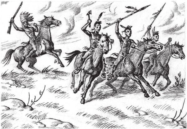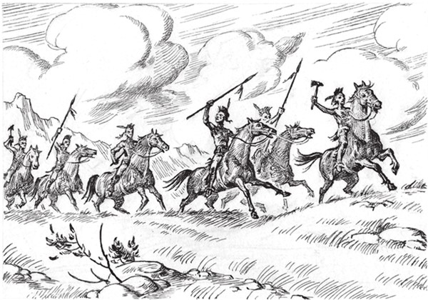 По приказу вождя женщины рядом с собой усадили детей к себе на лошадей и отцепили волокуши. Лучше потерять жилище и утварь, чем жизнь. Без домашнего скарба женщины с детьми в случае опасности могли ускакать прочь. Неприкосновенный запас вяленого бизоньего мяса и сушеных кореньев и ягод они носили на поясе в кожаных мешках.