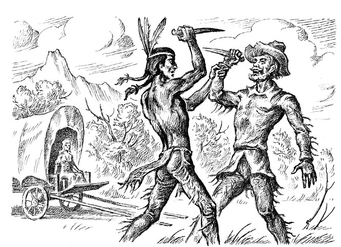В тот же миг дакота вскочил на ноги. Билл выстрелил, но пуля только задела индейца. Один прыжок, и он оказался лицом к лицу с врагом. Последняя пуля ушла в воздух. Билл выпустил из рук пистолет и выхватил нож. Дакота едва успел увернуться от удара, отскочив в сторону.