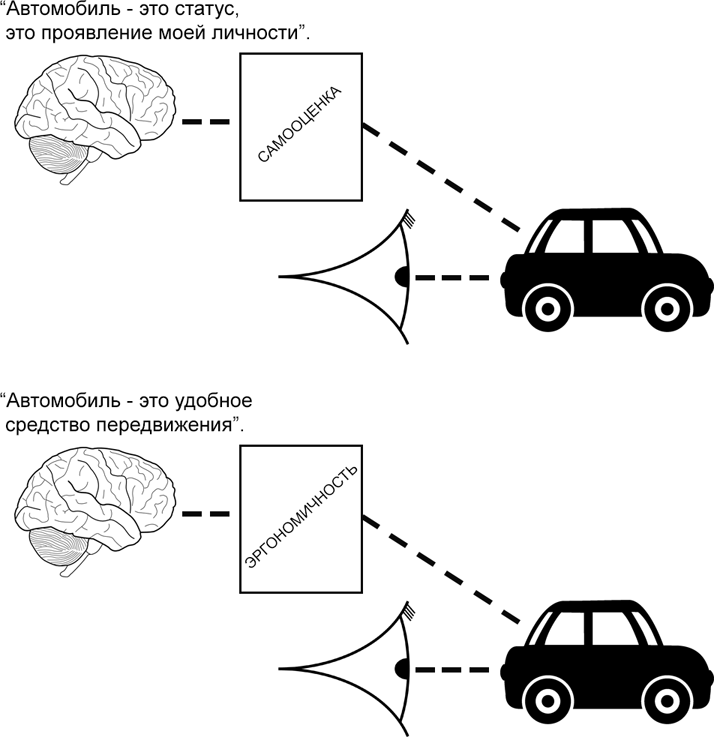 Для одних автомобиль через фильтр одобрения будет рассматриваться как мерило их личного и социального успеха. И не важно, насколько этот автомобиль будет нравиться им самим и насколько удобным он будет, главное, что он имеет некую положительную оценку в глазах большинства. Другие будут смотреть на автомобиль через фильтр эргономичности, выбирая тот исходя из полезных функций авто и его способности удовлетворить нужды водителя. Автомобиль может быть абсолютно одинаковым в обоих случаях, но разные люди будут оценивать его по-разному, исходя из фильтра, через который информация поступает в мозг.