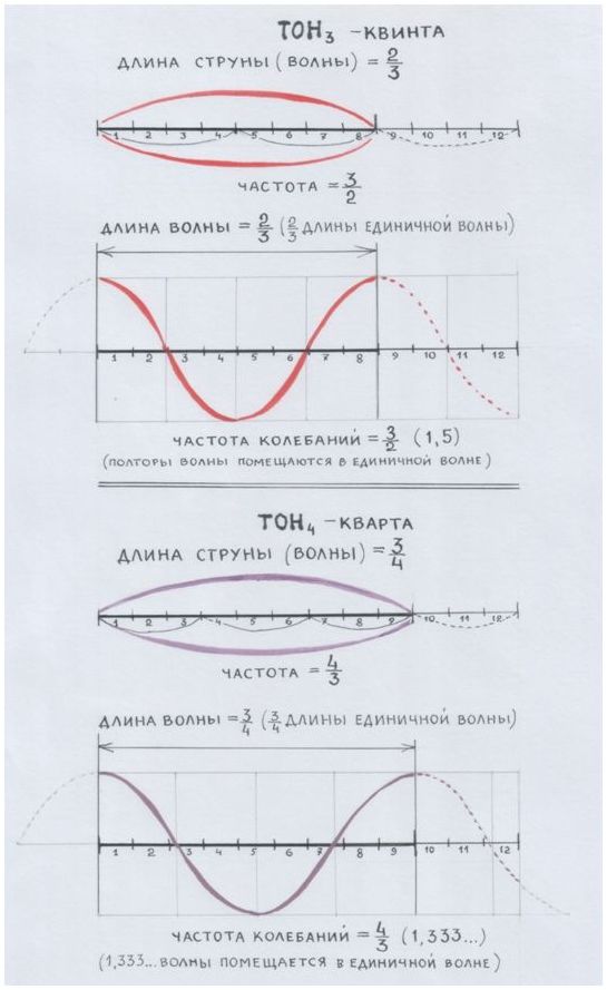 Струну Пифагор поделил на четыре части и установил зажим между тремя и четвёртой частью: длина струны – ¾. Частота колебаний – 4/3.