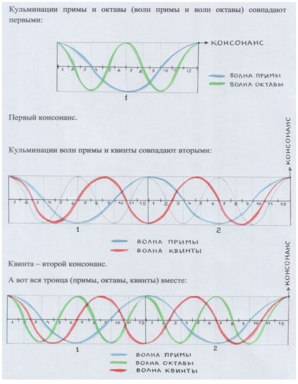 А почему бы и нет? Мы же видели несколько страничек назад, что кварты в октаве появились благодаря двум квинтам, двум совершенным консонансам: квинта снизу вверх (от примы к октаве) х квинта сверху вниз (от октавы к приме), в результате их перекрёста. Кроме того, сама октава появляется в результате умножения квинты на кварту: 2/3 х 3/4 = 1/2, 3/2 х 4/3 = 2 (длина волны и частота октавы).