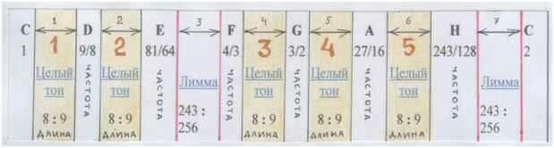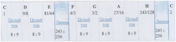 Давай посмотрим на одну таблицу. Она показывает следующий этап процесса сотворения музыкального строя Пифагором: вычисленные им остальные звуки октавы.