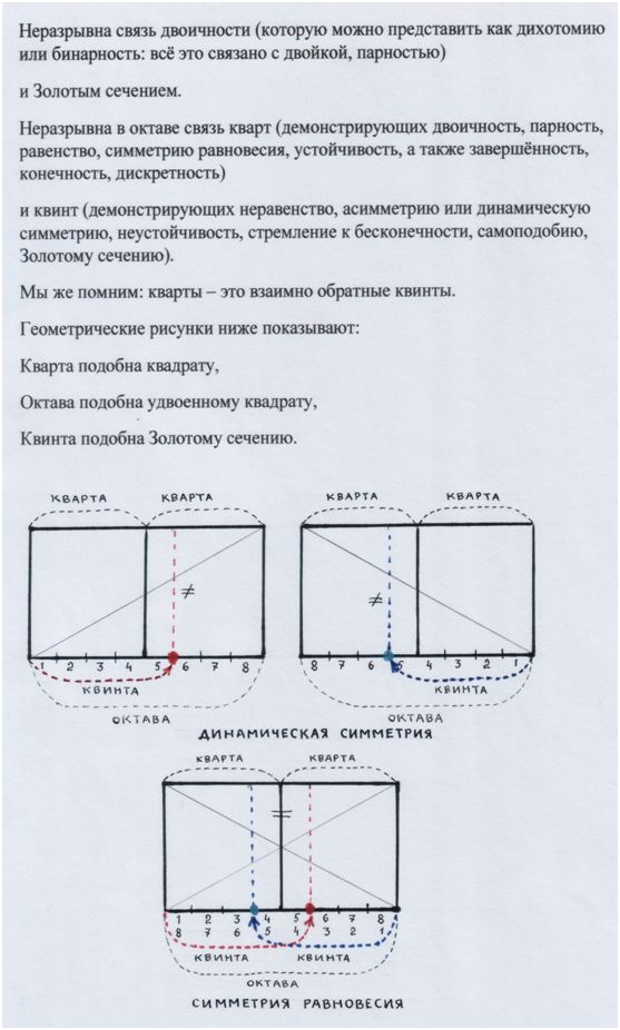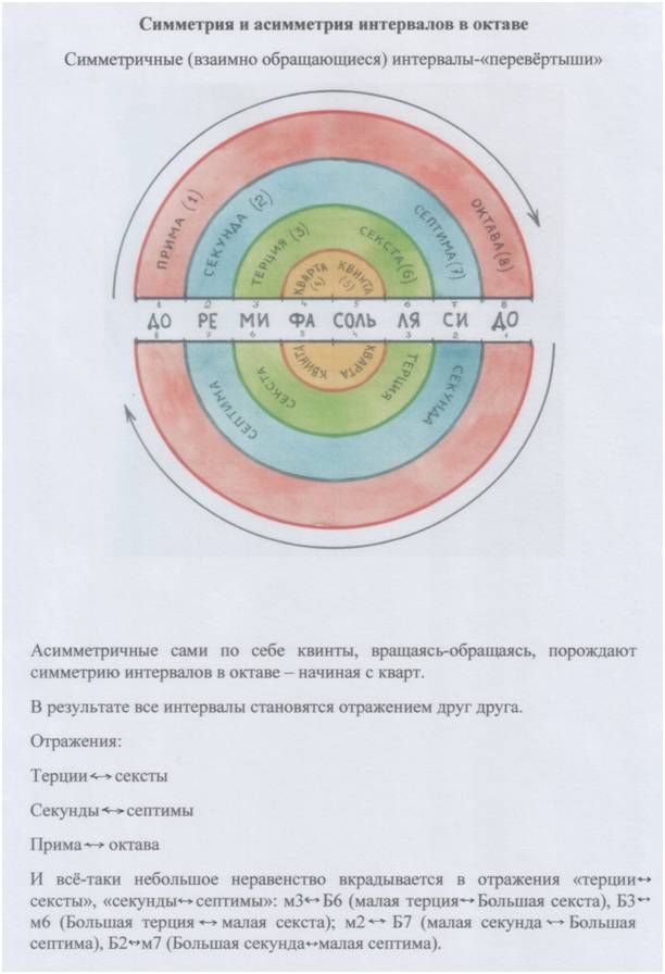 Вот! В диапазоне октавы после согласия-резонанса наступает поворот-отражение. Октава – словно зеркало, в котором квинта отражается в кварту! И все остальные звуки отражаются в обратном порядке. Повороты-перевёртыши. И… с и м м е т р и я: левое – отражение правого, правое – левого. И так – опять до примы, пока не замкнётся кольцо. И всё повторится снова.